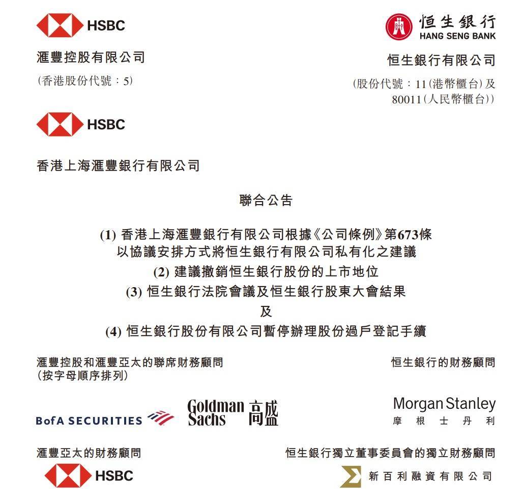 1月8日,据汇丰控股与恒生银行联合公告,汇丰将恒生银行私有化的建议获恒生银行法院会议、恒生银行股东大会表决通过。在计划变成具约束力且生效之前提下,预期恒生银行股份于香港联交所的上市地位将于1月27日(星期二)下午4时正被撤销。